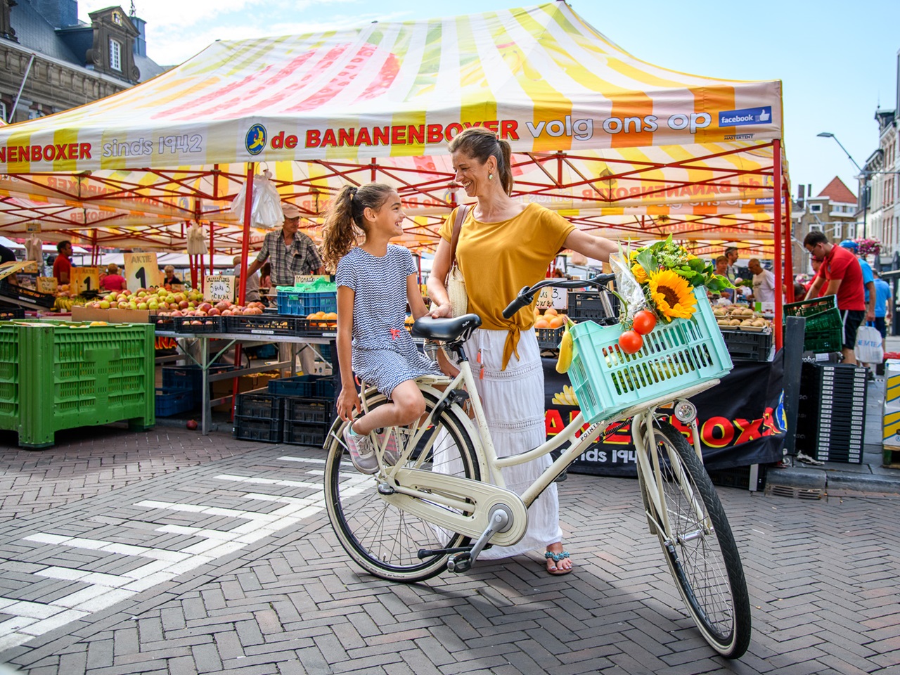 Mother and daughter with a bicycle in front of a market stall at the weekly market Roermond.